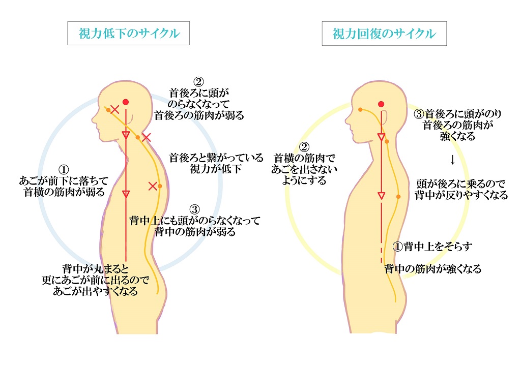 肩や首の凝りが目の疲れやドライアイの原因となりますように、 また、中国由来の目の疲れを取るツボが首後ろにありますように、 目は首後〜肩の筋肉と強く関係しています。・・・・ですので 頭が前下に下がった状態が続くと首後〜肩に頭の重さが乗らなくなり ↓ まず、首後ろの筋力が徐々に低下 ↓ 首後〜目とつながっている全体の筋力・血行の低下が続くと ↓ 視力の低下・・・に至ります |